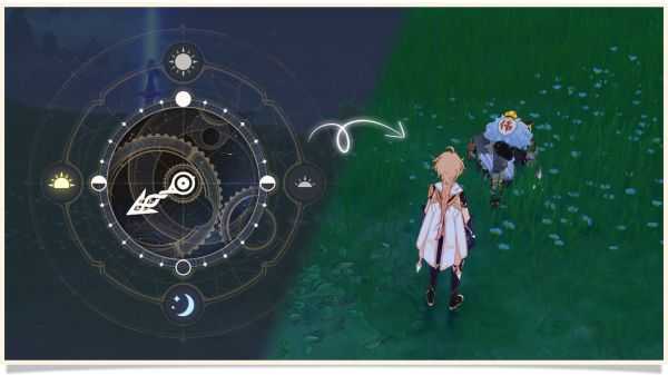 获得线索后,旅行者们需要在正确的时间段内到达该区域,找到并击退「奇怪的丘丘人」。 旅行者们可以通过左上角「菜单」界面中的「时间」功能来调整时间段哦~