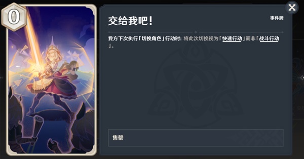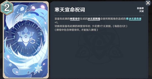 绫华专用卡,全冰伤+1,打出去之后切绫华可以一回合一次免费,配合前台莫娜或「交给我吧」可以无条件速切人。核心卡,直接下2。
