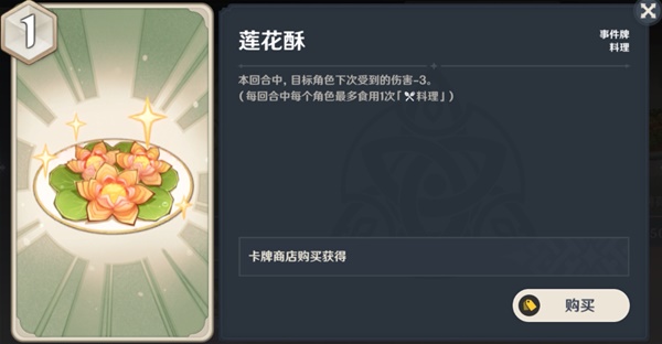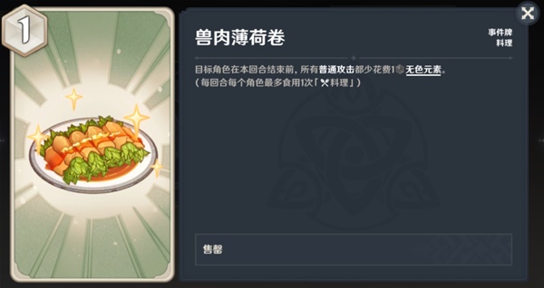 由于绫华使用普攻配合雨帘剑输出,所以「兽肉卷」也是核心卡之一。这张卡打出去之后,哪怕只用出一次普攻,费用消耗也能拉平不使用「兽肉卷」的普攻,在此之上多用一次普攻就剩一费,爆发回合能多砍一到两刀,也就是保底多6伤。核心卡,下2。