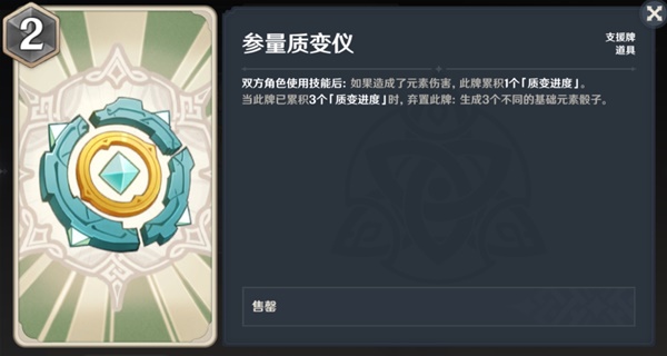「质变仪」需要重点讲下。双方使用技能后造成元素伤害,注意“后”,哪怕对面用的是物理伤害的普攻,只要触发了后台协同攻击比如香菱旋火轮、行秋雨帘剑等都是增加计数的。另外质变仪没有卡名一回合一次。就是说多个质变仪会同时增加计数。