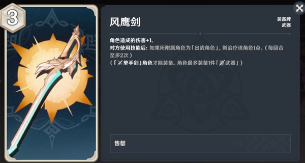 「风鹰剑」,神器,下2。每回合最多回2血,用过的都知道强度。拿来给行秋苟场的话再合适不过。并且还能+1伤,骰子用不完的时候也可以拿给绫华加伤。