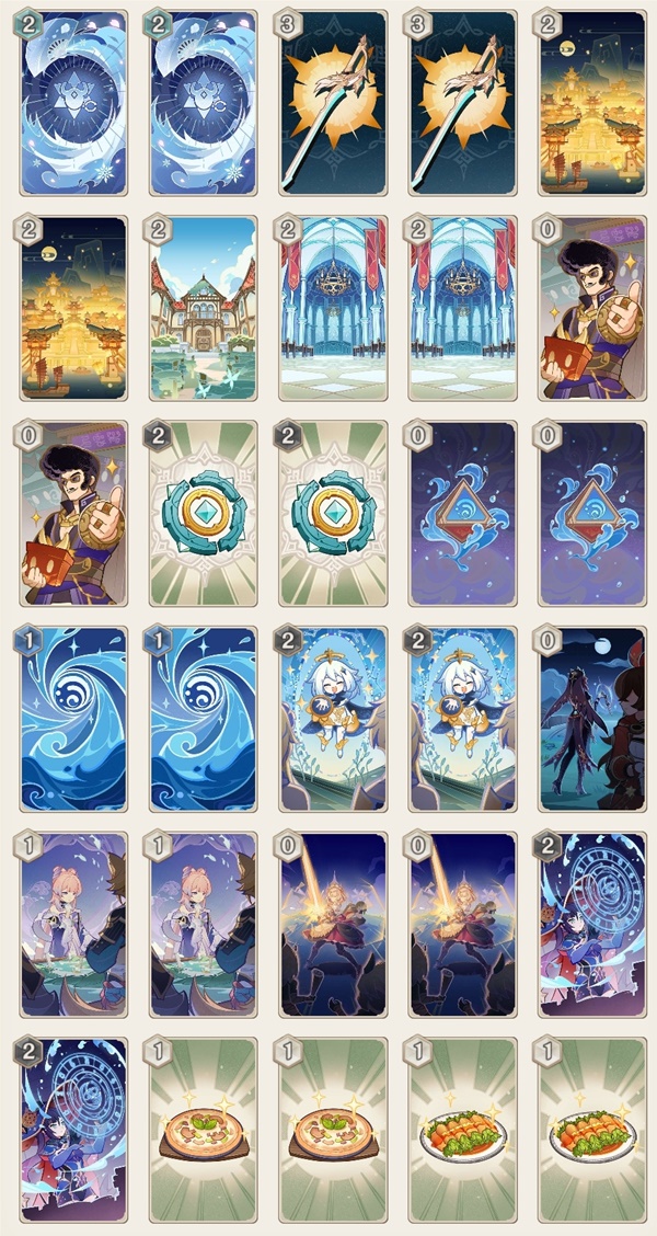 而且打反应,尤其是T1就打反应,对骰子要求很高,你需要准备两组三同色骰+1换人用骰子,剩下的骰子几乎无法做任何事。而且为凑齐2组三同色骰子,你还需要在卡组中投入更多洗骰子组件(2费派蒙,和0费凝光)。