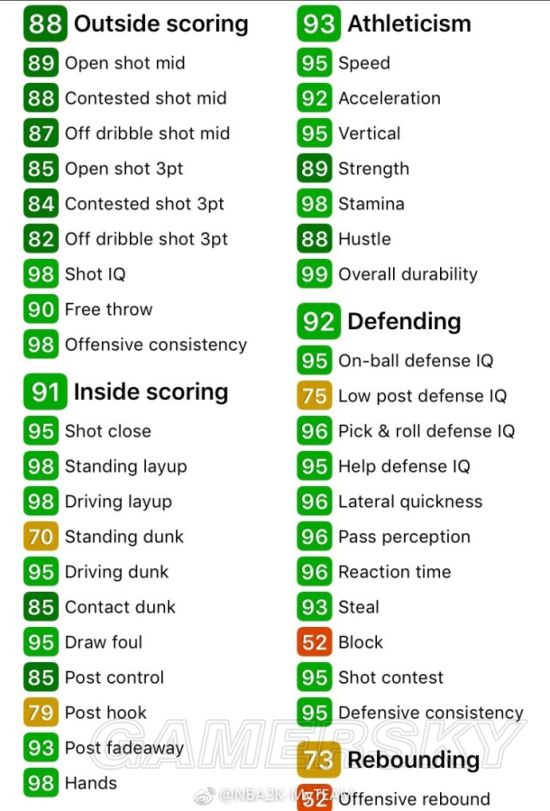 控球86,空位三分85,适合穿一双欧文3钻鞋去打控卫,不过88的带球速度是无法再弥补了;内线终结没问题,95突扣+85隔扣+双95扣篮倾向;防守极其出色,美中不足的是只有52的盖帽和不到80的篮板。自带4个紫徽章,分别是空中魔术师、无情终结者、挡拆战术大师和追帽大师。
