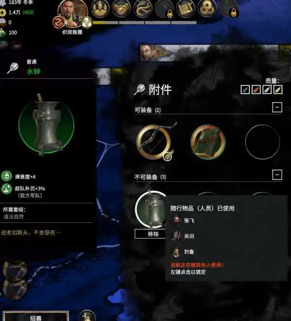 什么意思呢?意思就是【受命于天】前期还没有城池的刘备军,民兵维持费用为0,【派系领袖特性+无地派系】。
