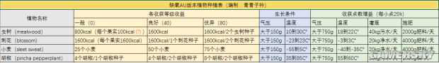 现在收获植物在最后一次收获时才有可能获得植物种子,前几次都没有种子,而获得食物材料和种子的数量是由收获点数决定。在收获点数<40时,获得一般的收成;40-80时,获得良好的收成;>80时,能获得大丰收(自创,按翻译应该是杰出的或者非常优异的)。不同收获点数,收成也不同,具体收成在2楼表中浅黄色一栏中给出。这一栏非常重要,非常重要,非常重要,可以专开一帖讨论,种植园建设时必须要用到这一栏,内容太多这个帖不展开。
