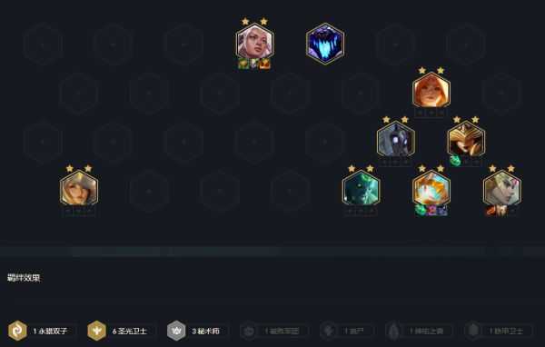关键羁绊:6圣光+3秘术。阵容主C大眼,副C辛德拉/天使/维鲁斯,主坦芮尔。