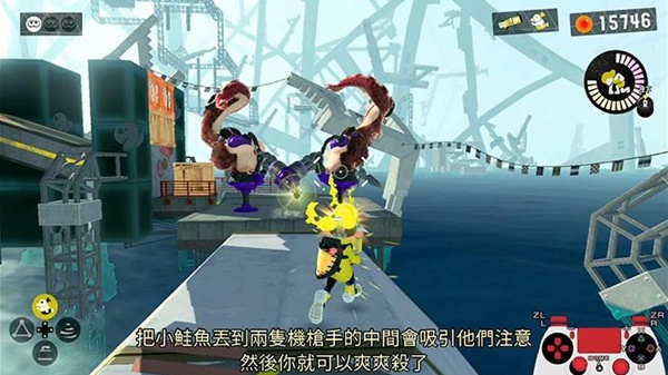 按住ZL跟B在墙上维持鱿鱼登顶的集气状态,在需要落到有甜甜圈的平台那边,技术好的人是在移动中途直接跳,技术不好就等机器停下,乔好视角,左香菇往下并松开B键进行鱿鱼滚行就可以很安全的跳到平台。
