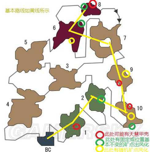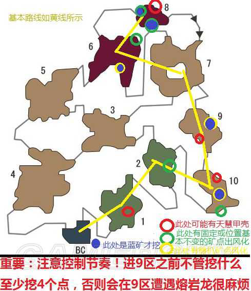 按黄线跑,节奏正确的话,采完10区,熔岩龍正好从9区进10区,完全不影响挖矿。