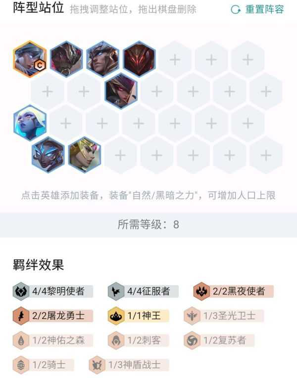 7人口凑了一下,阵容为瑞文,酒桶,风男,星妈,豹女,铁男,剑魔。此时羁绊为4黎明4征服。