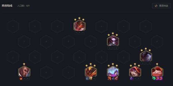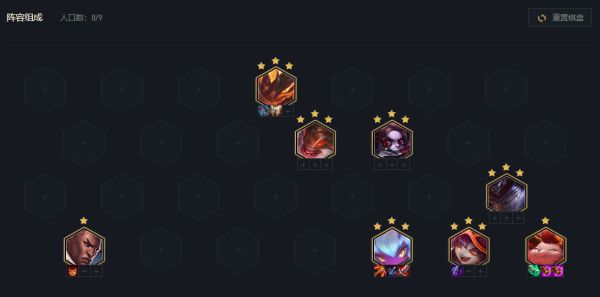 8人口后期就是补充一个提莫,如果炸弹人没有3星可以直接下了,如果炸弹人3星没有装备也可以下了替换成芮尔,但是需要注意的是3星小恶魔不建议大家直接卖掉,当前版本的转职书还是非常多的,找到一个小恶魔转职凑出8小恶魔并不是难事,等8小恶魔成型则是阵容的质变。