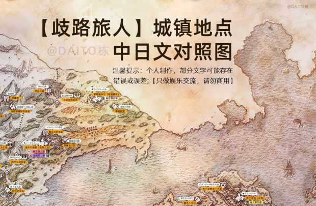 《八方旅人》中文与日文地图名称还是有差别的,大家在看日文攻略时地名可能分不清,不用着急,今天小编带来“Daito栋”分享的《八方旅人》中日文对照大地图,希望能帮到大家。