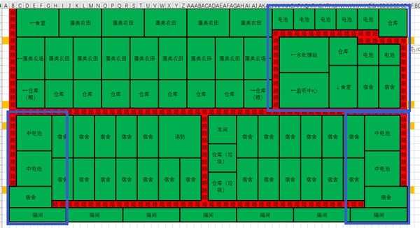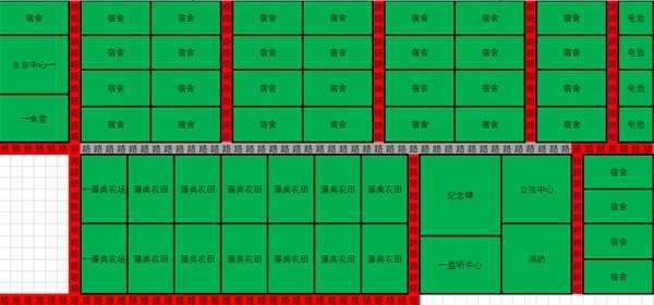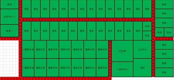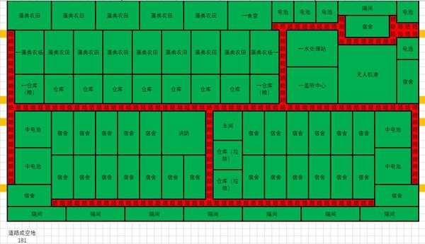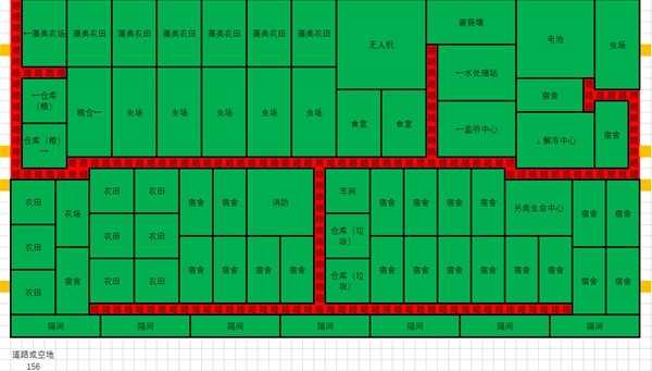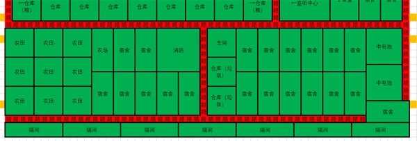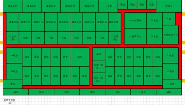 半农业半居住区(注:后期食堂不够了的话可以把中间的车间+垃圾仓库替换为2座食堂,把车间放到上方那一排仓库中)