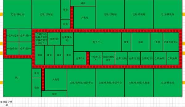 这幅布局中可以替换的还不少,除了一开始说的常见替换之外,还可以在中期将左上角钢厂替换为垃圾回收站,然后增大门口钢铁仓库的大小或者数量,就像这样: