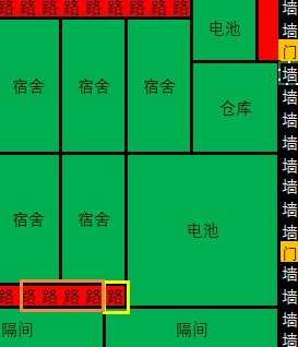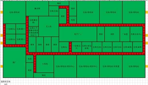 如图,黄框内的道路在这一布局下是下方的隔间与右方的电池唯一的与道路交互的接口,且3面都可以作为建筑的出入口。故而可以认为它的效率相当到。而旁边橙框内的道路同时是两个建筑唯一相邻的道路的一边,去掉其中任何一个或几个都需要至少相同数量的道路去制造连通的路径一使右边的宿舍、隔间、电池有相邻道路且与主道路连通。故而可以认为这几格道路的利用率较高。而在下图中: