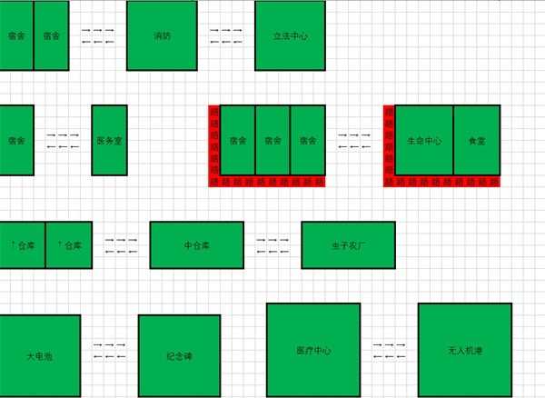 对称、康庄大道、极高生活水平、极限压榨等。。。不同人心目中的“美好”的布局不同,而游戏中通过所需的布局实用方面的要求并不高,而且上限也就在那儿,没有太多的可玩性。所以大多数情况下追求更“好”的布局是为了更符合个人喜好。不同的喜好和目标会让人选择不同的布局,故而这篇文章标题也说了的主要是供以参考。我个人一些非实用性的追求就是每个建筑都可达、尽可能地减少道路或空地但又不对物流造成过大困扰、不死一人、然后还有上面所说的救狗的追求,所以电池也必须与路相邻、治疗中心不能少。