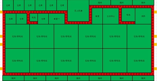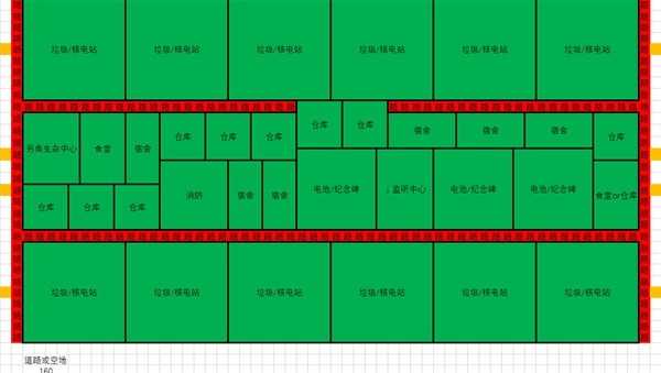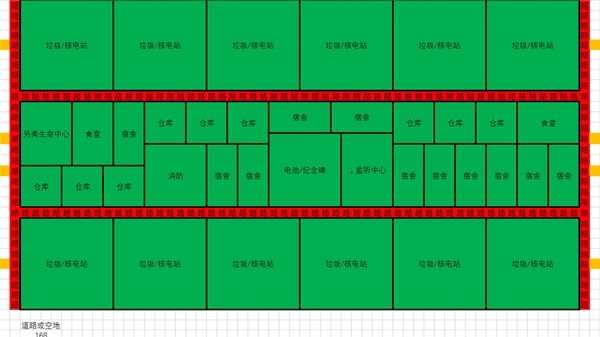 垃圾回收区的布局没有和上面的放在一起是因为这个布局的使用价值比起上面其它的建筑更低,在不更改的情况下不推荐使用。这个因为这里有大量的人员居住在隔间所以会有一个debuff,虽然立法中心能防止满意度太低,我们也可以通过监听中心更改政策来增加幸福度,不过不太符合我个人的追求。但是没有实用价值不代表没有参考价值。这里有12个垃圾站可行的选址,垃圾区二级专业化只需10个回收站即可,所以可以拆到两个回收站换成其它的建筑。然后这里的隔间所提供的人口也是远远足够的,所以我们也并不是说一定要按照这上面的布局来,可以适当拆除几个隔间和核电站换成智能宿舍以增加稳定度。如果你按我说的区划规划的话无人机港在这里也不是必需品,因为这里左邻居民区右邻仓库,取垃圾和放产物都十分方别。故而这里的无人机港可以换成大仓库或者提供空地以方别其余地方布局。不追求垃圾产量的话也可以仿照工厂的布局让回收站在上下两边,中间留出12格以2过道+(4+6)or(3+7)的仓库、智能宿舍、稳定性建筑的组合。可以参考下图: