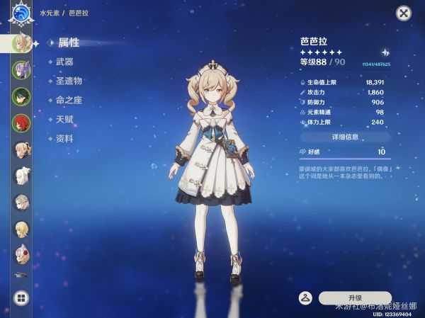 芭芭拉作为新手四星角色,前期奶量可以,不吃多少装备,也是唯一一个有大招过场动画的四星角色,好感度任务里作为一个偶像,有自己的应援团队,但是其动不动就躲起来不理玩家的举动让不少玩家粉转黑(学学人家诺埃尔啊)但是我这种肥宅除外,得不到的一直在骚动,老子阿宅就喜欢这味。从开始到现在。