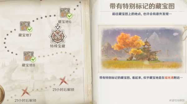 很多玩家在偏右上的海滩上逛了半天也没有看到宝藏,就是因为实际上正确的藏宝地地点偏向了归离原一带。