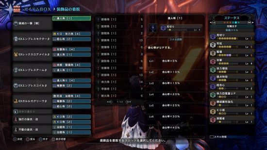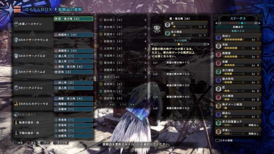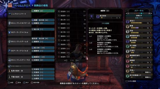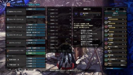 见切7、破坏王3、弱点特效3、挑战者5、匠1、超心1、耳栓5、体力3、耐冲1。
