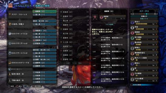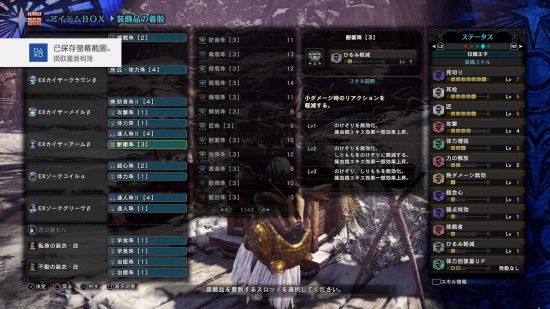 炎王龙头B、炎王龙身体B、炎王龙手B、冻鱼龙腰B、黑狼鸟脚B、匠护石、转身早食2、不动治癒2。
