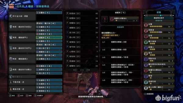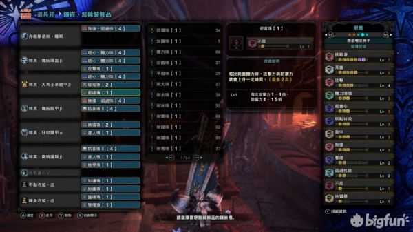 也可以将手部防具换成绚辉龙的,腿换成猛爆碎龙的,这样可以比上面配装多出一个大毅力。