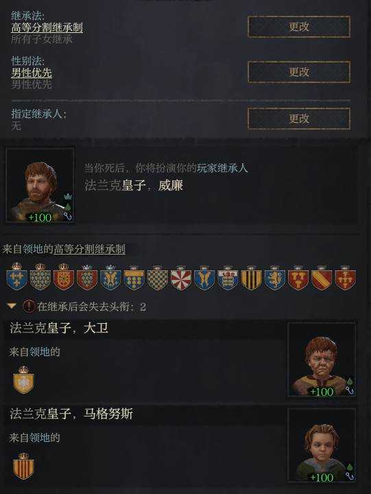然后就是除了主头衔法理头衔优先给主继承人,其他的头衔分配似乎是随机的,但是你可以通过提前把分配给大儿子但是你不想要的头衔封给其他继承人,来改变这个随机的继承分配,这个在有高等分割之前尤为重要,最终就是其他继承人在继承第二等级头衔至少不比你的主继承人少,就能保证你的主继承人能继承你想要的肥地(一般就是首都法理公爵)(所以前面说可以创建一点无关紧要的头衔塞给其他继承人)(或者直接简单玩选举……)