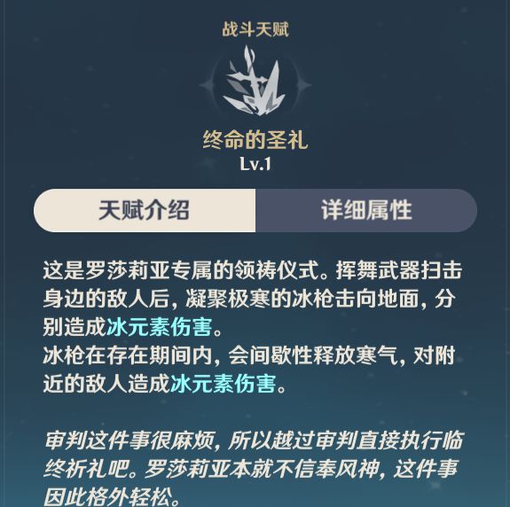 元素爆发天赋:留下个冰枪持续造成冰元素伤害,持续8秒冷却15秒,需要60点元素能量,挺好充能释放的,2命后延长4秒,共持续12秒,也就是说只有3秒真空期,实际操作时基本也是能无缝大招的,毕竟切换角色也是有冷却时间限制的。