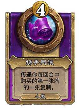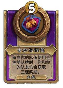 每当你的队伍使用金色随从牌时,你和你的队友均会获取三连奖励。