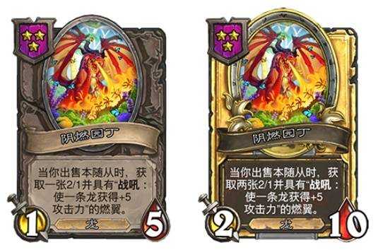 1/5。当你出售本随从时,获取一张2/1并具有“战吼:使一条龙获得+5攻击力”的燃翼。