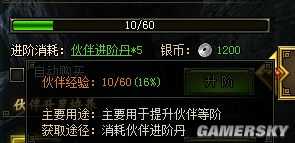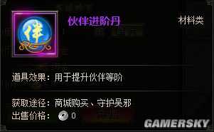 伙伴进阶消耗“伙伴进阶丹”增加伙伴经验值(伙伴等阶越高材料消耗数量越多);