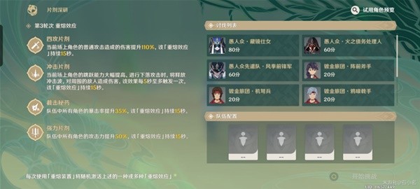 「片剂深研」从活动的第一天起,每两天会开启一个新的挑战。挑战中,可以使用活动提供的试用角色或自己拥有的角色,连续进行3轮战斗。