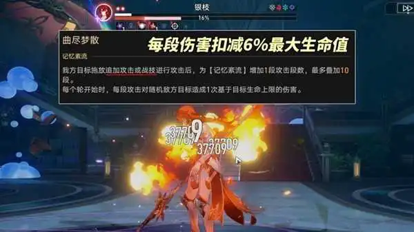 我方每次施放追加攻击或战技,会使下轮次开始时【记忆紊流】的随机攻击段数+1(至多10段),每段会对精英/首领造成6%最大生命值伤害。