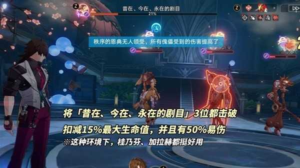 ※同时击破「昔在、今在、永在的剧目」三位精英敌人韧性条,会扣减对方15%最大生命值,并获得50%易伤收益。当你不知道带什么时候,塞个没啥练度的桂乃芬也挺好用的,至少能快速击破~