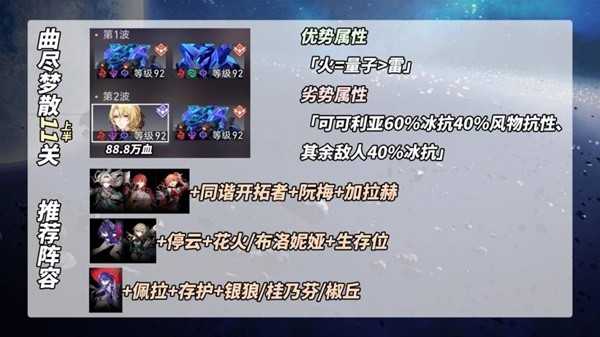 【上半】优势属性「火=量子>雷」,劣势属性「可可利亚60%冰抗40%风物抗性、其余敌人40%冰抗」。