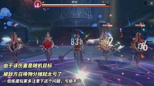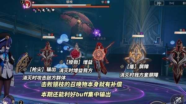 ※重点注意银白色单位,会为银枝添加屏障阻隔伤害,可考虑优先解决或留进攻型技能防一手。若是练度不够想依靠环境buff,可考虑先消灭枪尖,亡语是群伤可以帮你压低其他召唤物血线。