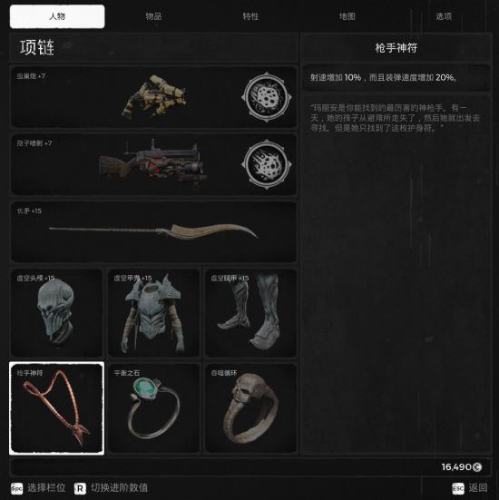 饰品:枪手神符(+射速换弹);痛苦之岩(受伤增加移速、装弹速度,在梦境中很好用);残暴印记(半血以下增伤);戒指:平衡之石(攻击加成);吞噬循环(3倍暴击伤害及其夸张,我单刷使用孢子喷射触发过,本BOSS瞬间没了5分之三);闪避戒指。