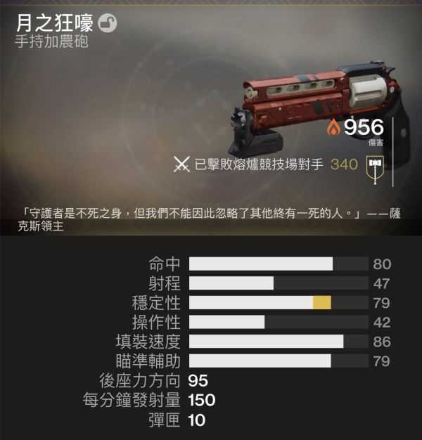 在pvp中的表现为两枪头,第三枪击中同样的对手的“任意部位”即可击败对手150的高射速,极佳的射程,不算慢的换弹速度,专属的技能宏伟之嚎,以及极佳的稳定性,都是他的加分项。
