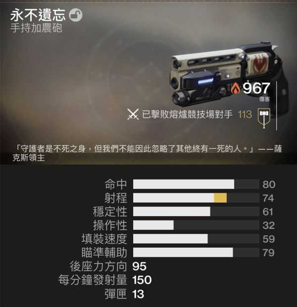 缺点2:这是一把能量火属性的手炮,意味着他和目前版本强势的副手霰弹心操和朝花夕拾不能兼容,好在他可以配合主手的废除者进行搭配。