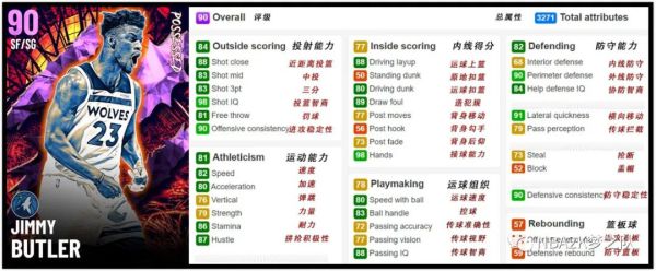 在今年季后赛中大放异彩的JB,也迎来了他在2K21中的第一张非现役卡。这张卡取自他在森林狼的时期,其横移和力量在同位置球员中算比较高的,能投三分也能扣篮。徽章的话,唯一紫章是绿色机器,但也有很多徽章不能升级,整体亮点不足,没有米切尔那么突出。