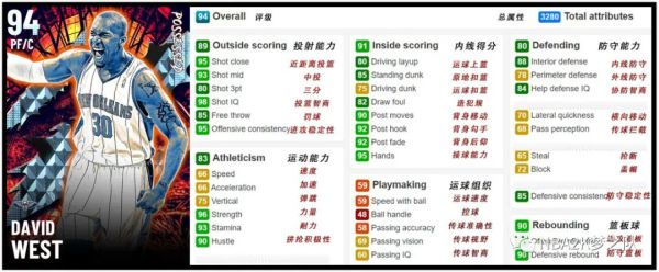 前段时间因为一则视频被冠以“党员”之名的大卫·韦斯特来了,这张韦斯特的特点在于力量极硬,而且能投三分,投篮包也不错,而且还有包括热区猎手在内的五枚紫章,是个标准的空间型内线。但他身高偏矮,而且建模也有点小,基础硬件不是很好。