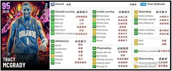 在2K21发售已经快2个月的时候,第一张麦迪终于来了,而且直接就是魔术时期的粉钻!这张麦迪在进攻端没啥毛病,突扣三分都在90以上,热区出色,但88双速略低,麦迪也只能穿阿迪,没啥特别好的钻鞋...麦迪的投篮包很舒服,运球包则是罗伊同款。不过这张卡的防守实在有点差,抢断只有64,而且居然没有任何一枚防守徽章,甚至连死亡缠绕徽章都不能打,这肯定是2K故意为之,以免麦迪过强。