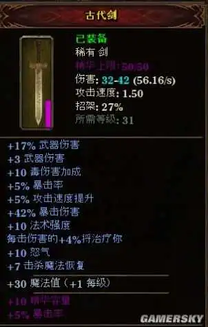 主要属性:精华容量30+,暴击5%,武器伤害+4,武器伤害+20%,攻击速度+6%,元素伤害+10,暴击伤害+44%