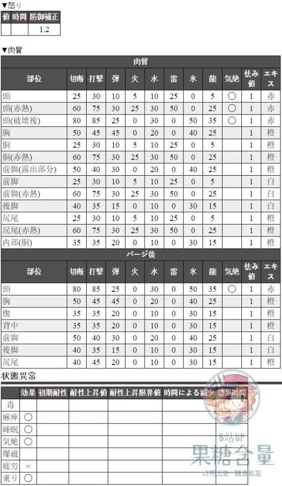 因为有些童鞋可能没看过我之前的文章,所以这里再补充一下,就先说雷弩吧,针对绚辉龙的雷弩不能出弱点特效!因为绚辉龙的肉质决定了它很长一个范围并不吃弱特,具体大家可以看下面的肉质图。绚辉龙四区同样可以使用冰弩,但是属性弹轻弩有个缺点,就是第一枪开出去后面三枪都是在同一水平线上,不能拐弯,但斩裂只要打到一发就可以了,而且皇后冥灯恰好有Lv2等级的睡眠弹和自带弹药节约,特别实用。