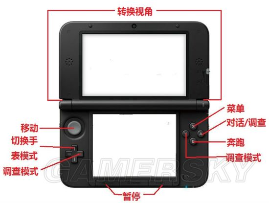 下屏幕:下屏幕其实就是地图。正上方是该地区的名称。右方可以用触控笔调整地图大小,不过能调整的范围很小。左上角是切换主线任务和支线任务(如果你接了支线任务就会出现)。红色箭头则是主线任务需要去的地方,如果改为支线任务那箭头则会变成蓝色。右下角的三个图案分别是菜单、调查模式和切换手表状态,但是所有功能用按键都能完成,个人感觉略多余。