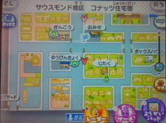 上屏幕:右上角是手表状态。如果是妖怪手表,那妖怪越近指针越靠近红色区域,眼睛也会越大。如果改为普通手表就能看现在的大概时间(就目前来看感觉没啥作用)。屏幕正下方是现在需要做的事情。另外如果奔跑起来主角身边会出现耐力槽,一共6格,耗完的话会进入疲劳状态慢步行走等耐力槽回复才能正常行走。上屏幕比较简单直观,就不再多做介绍了,接下来看看下屏幕。
