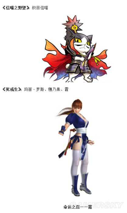 本作的角色虽然是从13个游戏中选取的热们角色,杂兵也由各部作品代表怪物代替,如讨鬼传中的鬼。这会给玩家带来新鲜感,刺激,但随之带来的问题也是很明显,那就是画风问题,虽然所有的角色和小怪,杂兵,光荣都有做动画处理,使之所有角色画风尽量和谐统一,但是不同的画风,除非角色画风全换,否则不和谐依旧不和谐。赵云和真田幸村进行最终对决,战争一触即发。织田信喵:天下布喵,喵 ~双方武将直接跪了,从热血跪倒在萌必杀的喵主子爪下,画面非常的醉人。不要以为游戏里面可以换服装,如王元姬可以穿霞的服装,玛丽·萝丝可以穿的欧波娜的套装等等,这并不能改变画面,人物崩坏,可以说是进一步使得人物混乱崩坏。