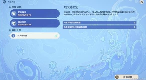 传送到辛焱活动「鸣弦列岛」,打开活动,可以查看森幻千事下烈火踏歌行里,尚未发现的宝箱数量,以及尚未发现的「幻境海螺」数量,当数量为0时,就是没有遗漏