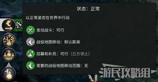 状态需要持有一定的行动点数才能启用。在诸如伏击或扎营等特殊状态下,军队无法移动。