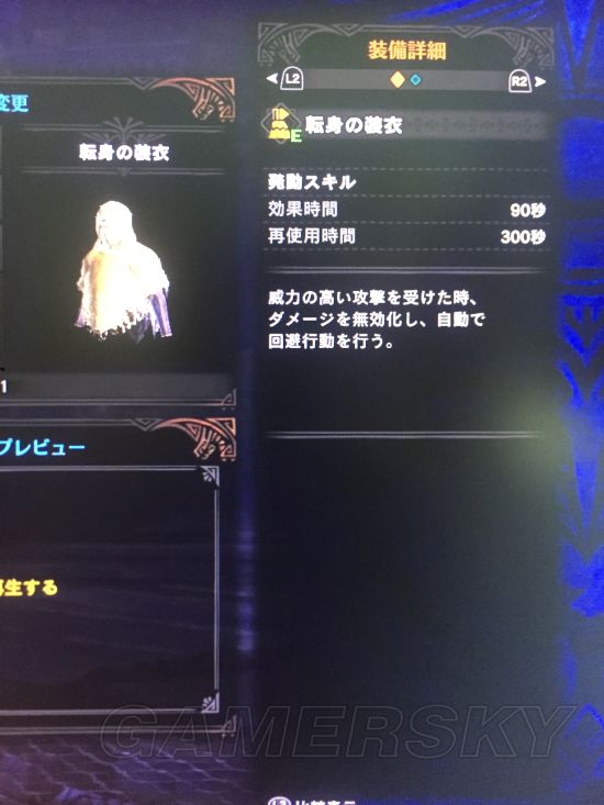 日文版的大意是“在受到高威力的攻击时,转身衣装将会使伤害无效化,并自动进行回避”。