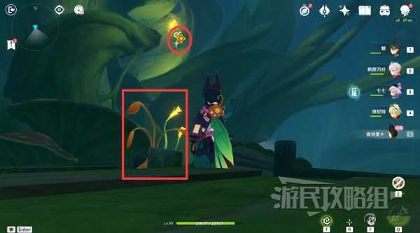 注意在激活草元素核心时,先用草元素攻击旁边的觉蕊,然后目标位置附近会出现四叶印,利用四叶印即可到达目标位置。